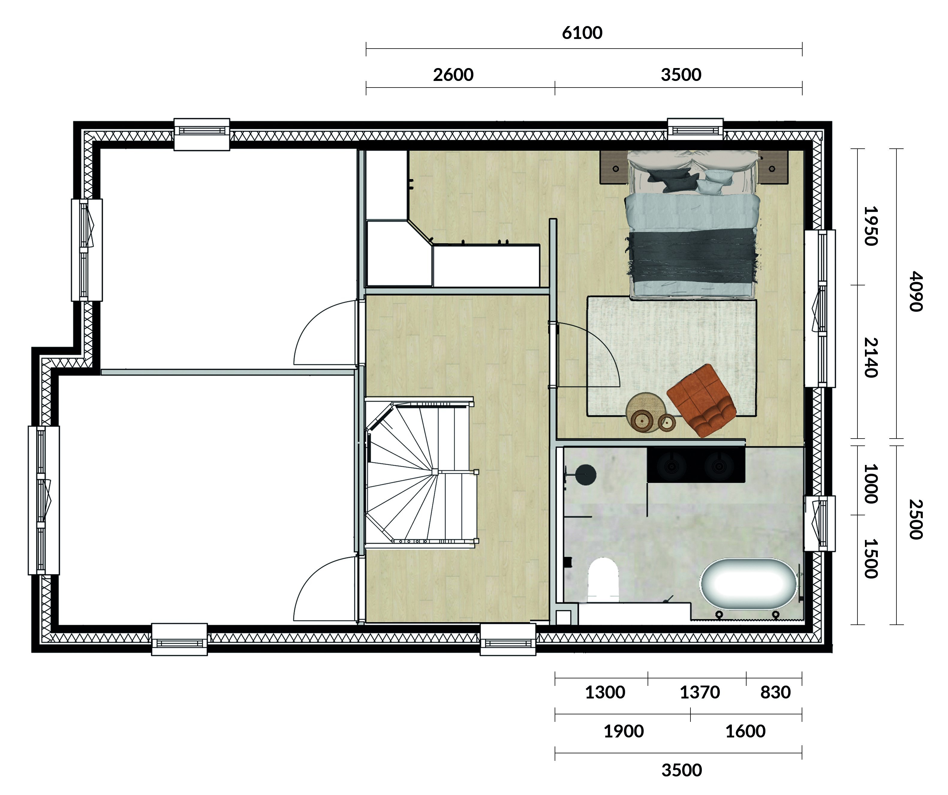 Tot slot heb ik deze 3D-impressies van de badkamer gemaakt waarbij meteen duidelijk wordt hoe het ontwerp eruit komt te zien.