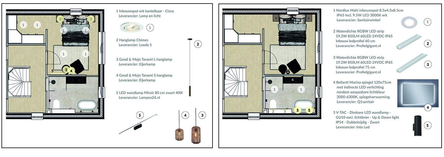 In dit lichtplan is goed nagedacht over de functie en sfeer van beide ruimtes. De slaapkamer krijgt warm, dimbaar licht voor rust en ontspanning, terwijl in de badkamer gericht functioneel licht gecombineerd wordt met zachte accentverlichting.