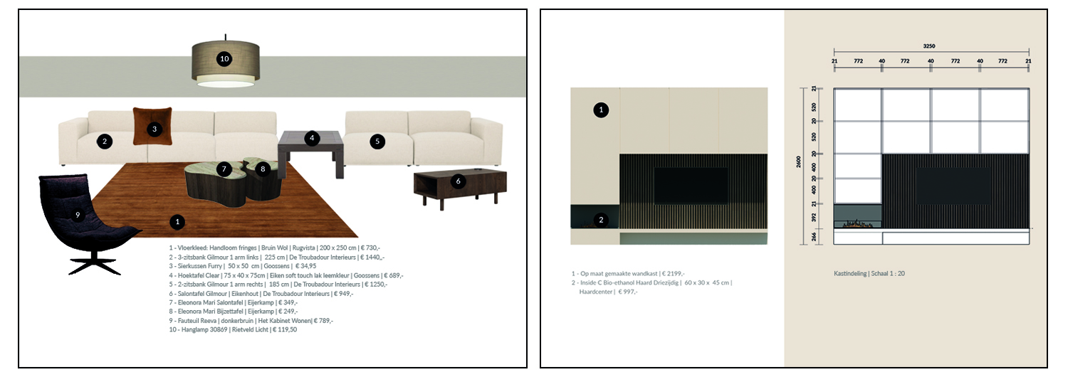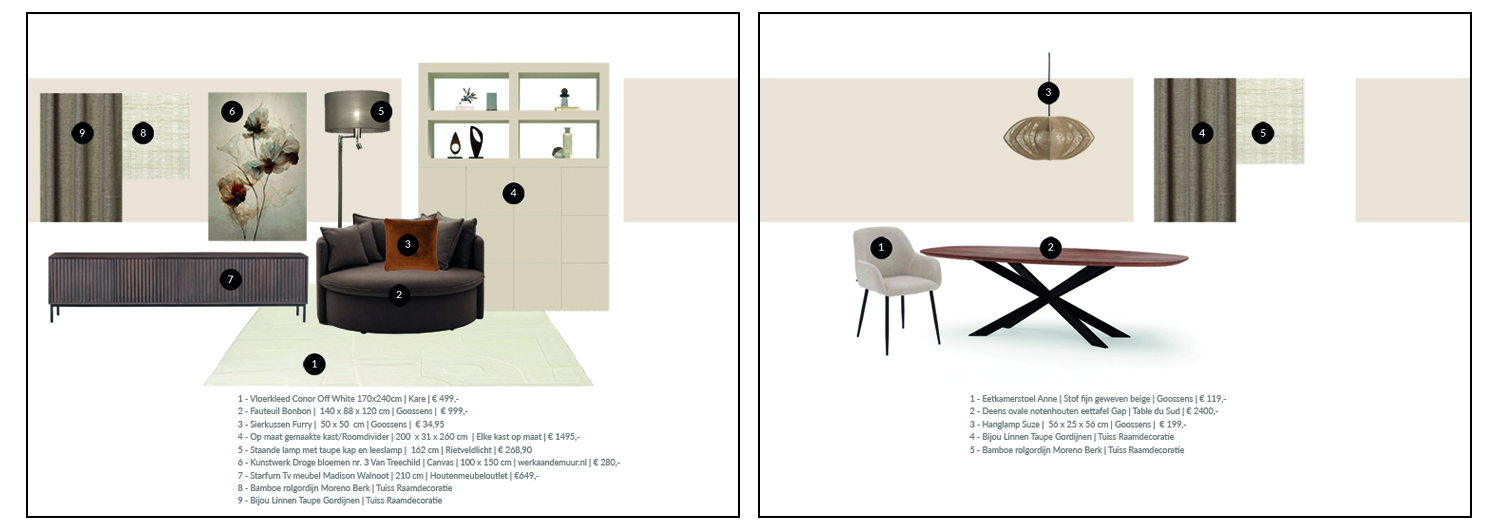 Het kiezen van de juiste meubels bij een ontwerp kan best een uitdaging zijn. Niet iedereen vindt het makkelijk, en soms ontbreekt simpelweg de tijd of zin om alles zelf uit te zoeken.Voor deze klant heb ik daarom ook een meubelplan gemaakt – compleet met overzicht van wat waar te koop is. Lekker overzichtelijk en meteen toepasbaar!