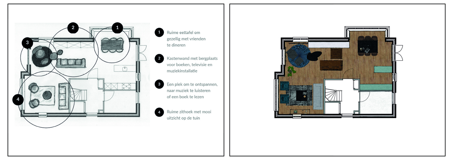 Deze afbeelding toont het ontwerp en de inrichting van een woonkamer, gepresenteerd in twee fasen: een schetsmatige plattegrond met toelichting (links) en een uitgewerkte plattegrond (rechts).