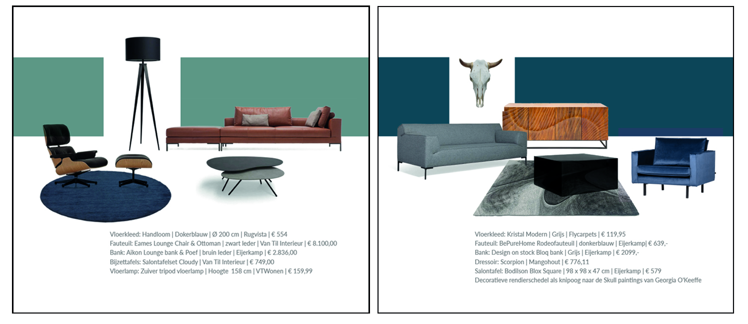 Woonkamer ontwerp voor een alleenstaande man van midden dertig. Volgens eigen zeggen is hij een workaholic, maar als hij thuis is, moet hij zich kunnen ontspannen. Hij vindt het prettig om naar klassieke muziek te luisteren, maar leest ook graag een boek en geniet van de fraai aangelegde tuin achter het huis.Hij wil een ruime zithoek met uitzicht op de tuin en in een deel van de ruimte een eettafel voor zes tot acht personen. Hij houdt van koken en het ontvangen van vrienden. Qua kleur sluit hij graag aan bij de kunst van Georgia O’Keeffe.