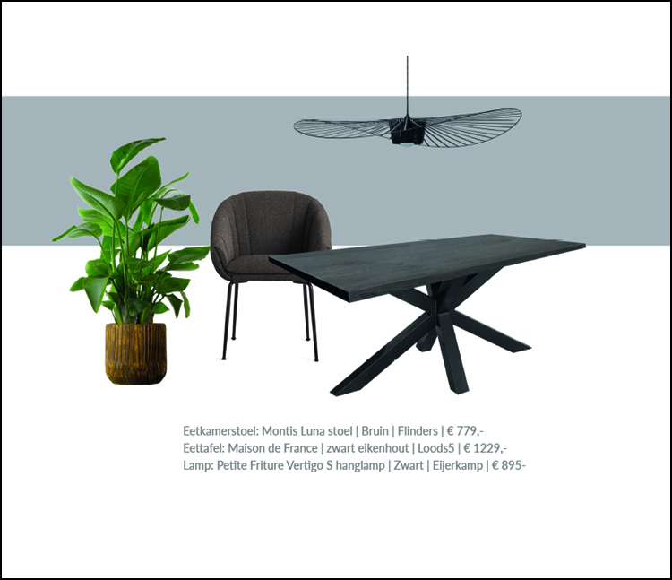 Het meubelplan combineert warme tinten met iconische designstukken. De Eames Lounge Chair en de Aikon Lounge bank in bruin leder zorgen voor een luxe uitstraling. Het donkerblauwe vloerkleed voegt diepte toe, terwijl de Cloudy salontafels en Zuiver tripod vloerlamp zorgen voor speelse, organische accenten. Een uitnodigende opstelling met comfort en stijl in balans.
