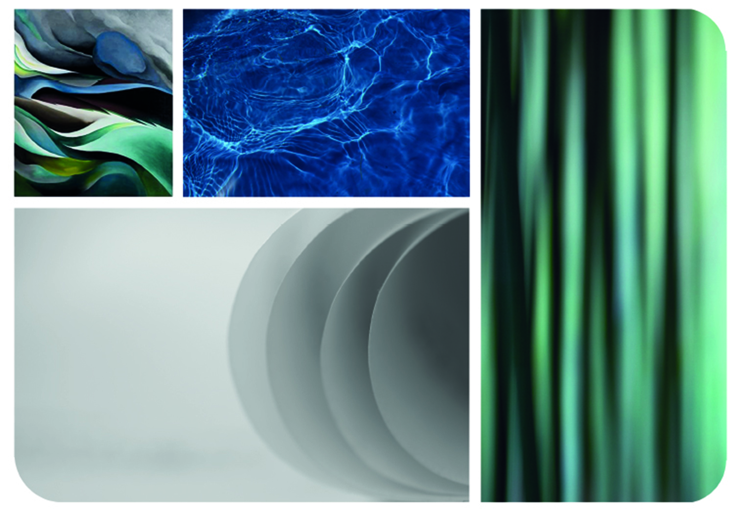 Dit moodboard vindt zijn oorsprong in het schilderij From the Lake van Georgia O’Keeffe, een werk dat de grenzen tussen natuur en abstractie op subtiele wijze laat vervagen. Het moodboard vertaalt deze sfeer naar een visuele wereld waarin vloeiende vormen, diepe blauwtinten, zachte overgangen en organische structuren centraal staan.